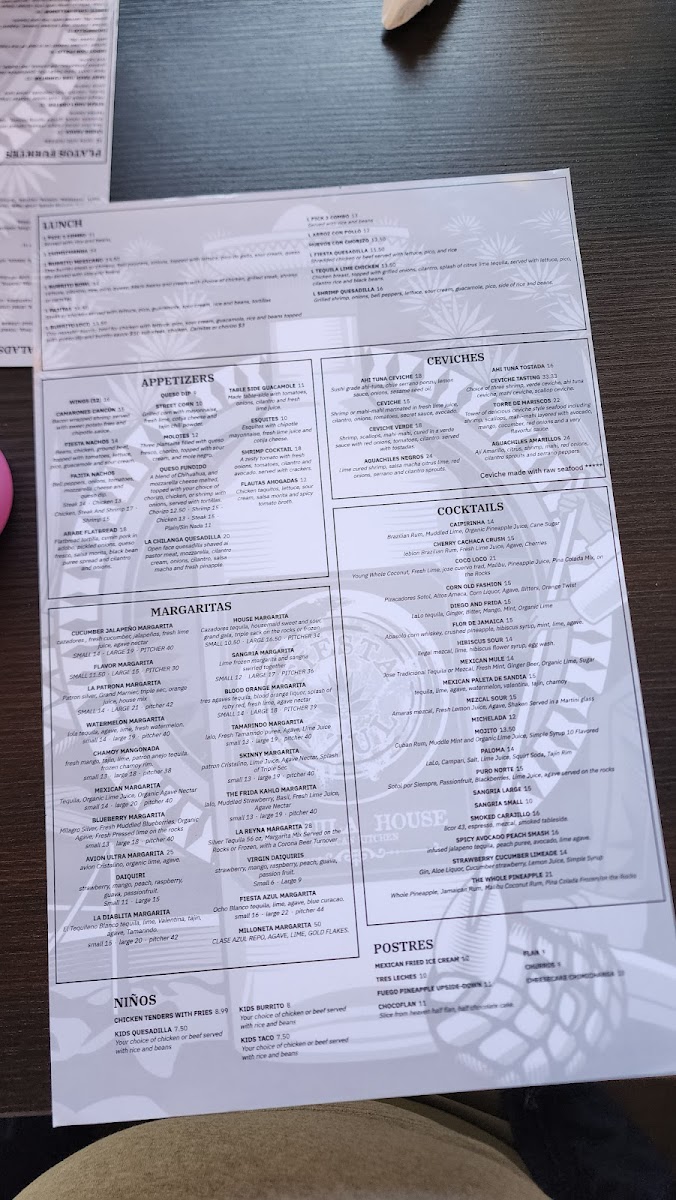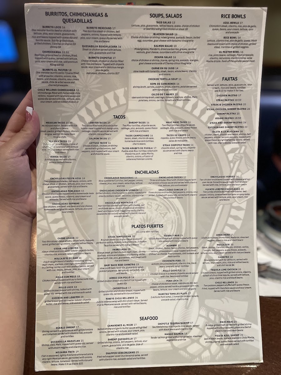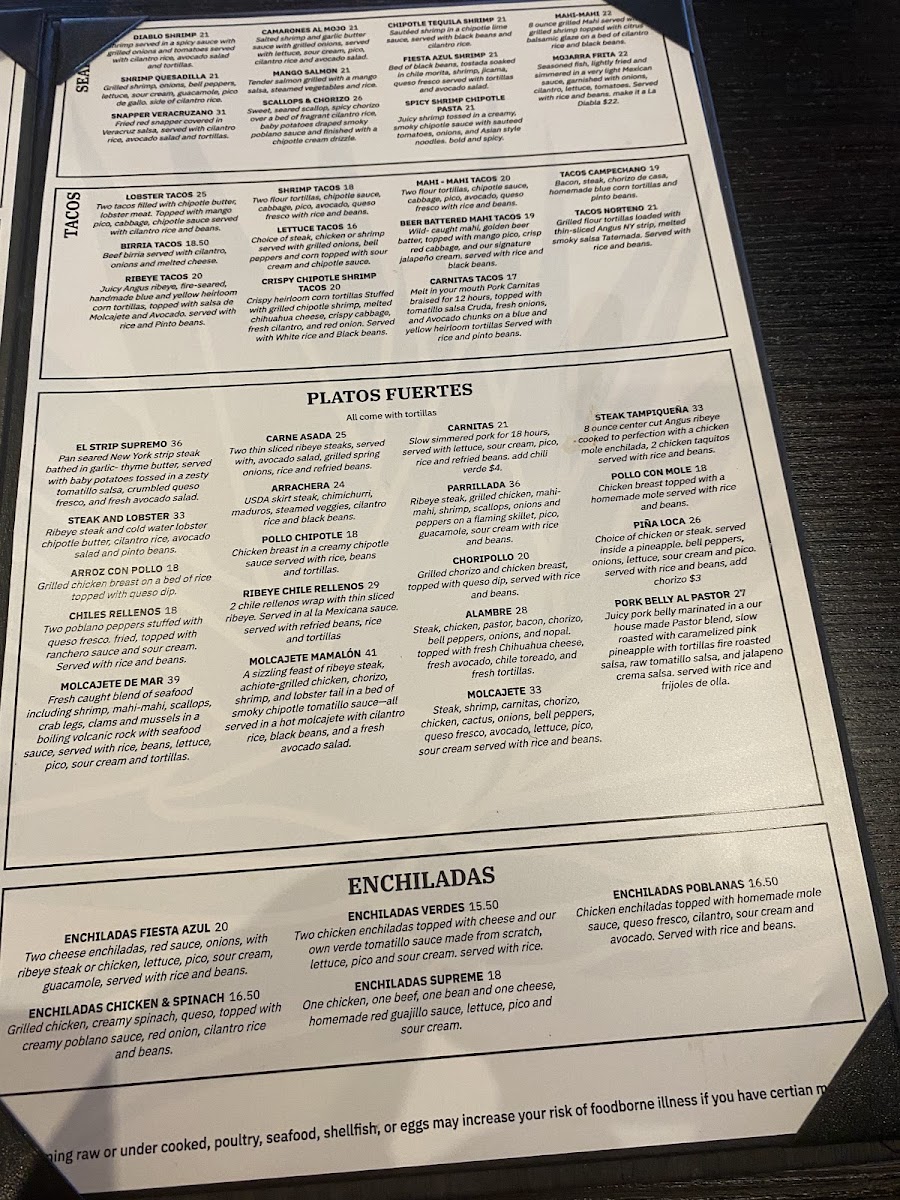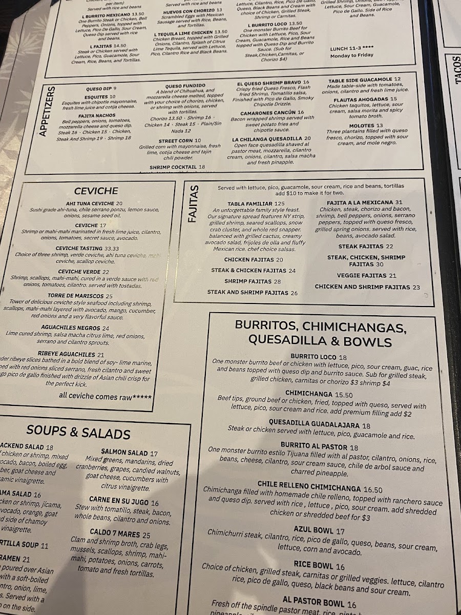 Steak, shrimp, Carnitas, chorizo, chicken, cactus, onions, bell peppers, queso fresco, avocado, lettuce, pico, sour cream served with rice and beans