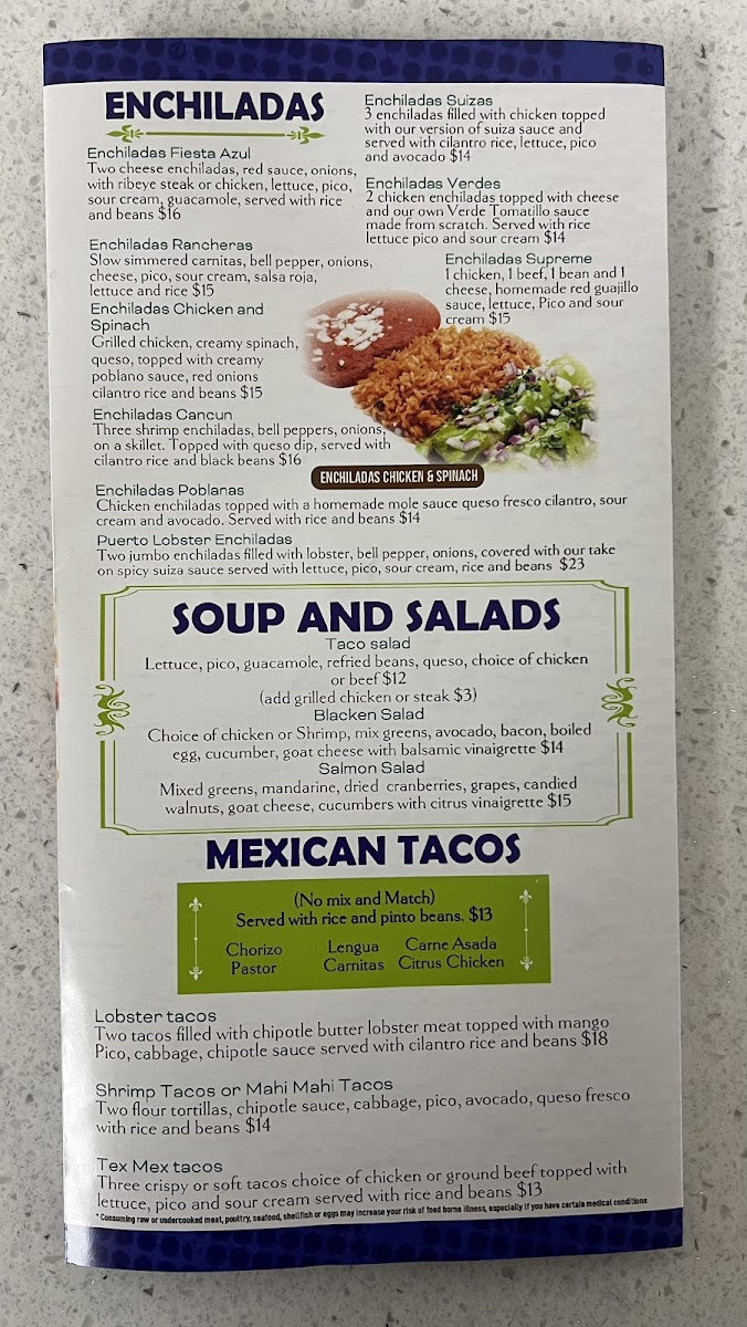 Two jumbo enchiladas filled with lobster, bell pepper, onions, covered with our take on spicy suiza sauce served with lettuce, pico, sour cream, rice and beans